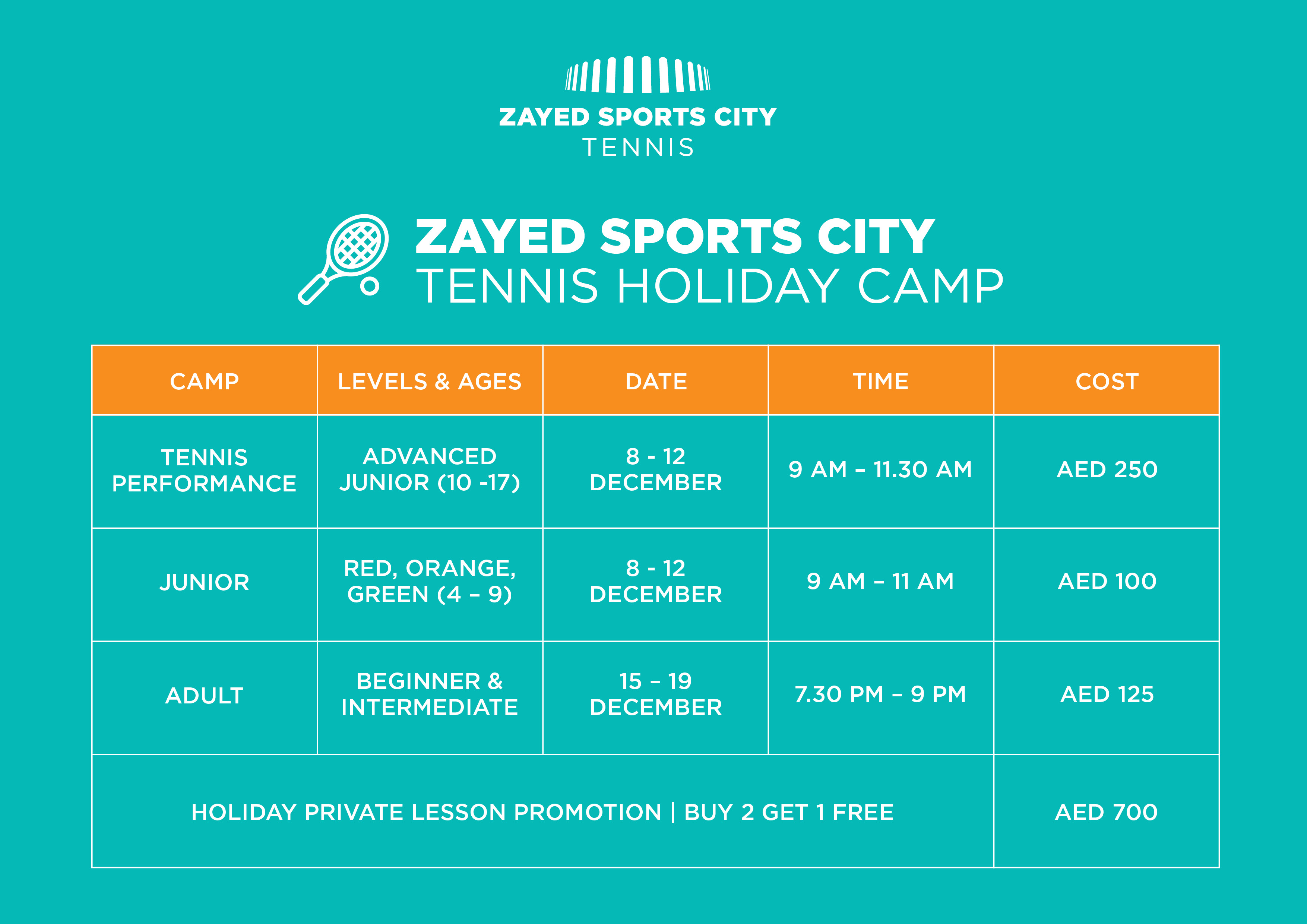 | HOLIDAY PRIVATE LESSON PROMOTION | BUY 2 GET 1 FREE | AED 700 |